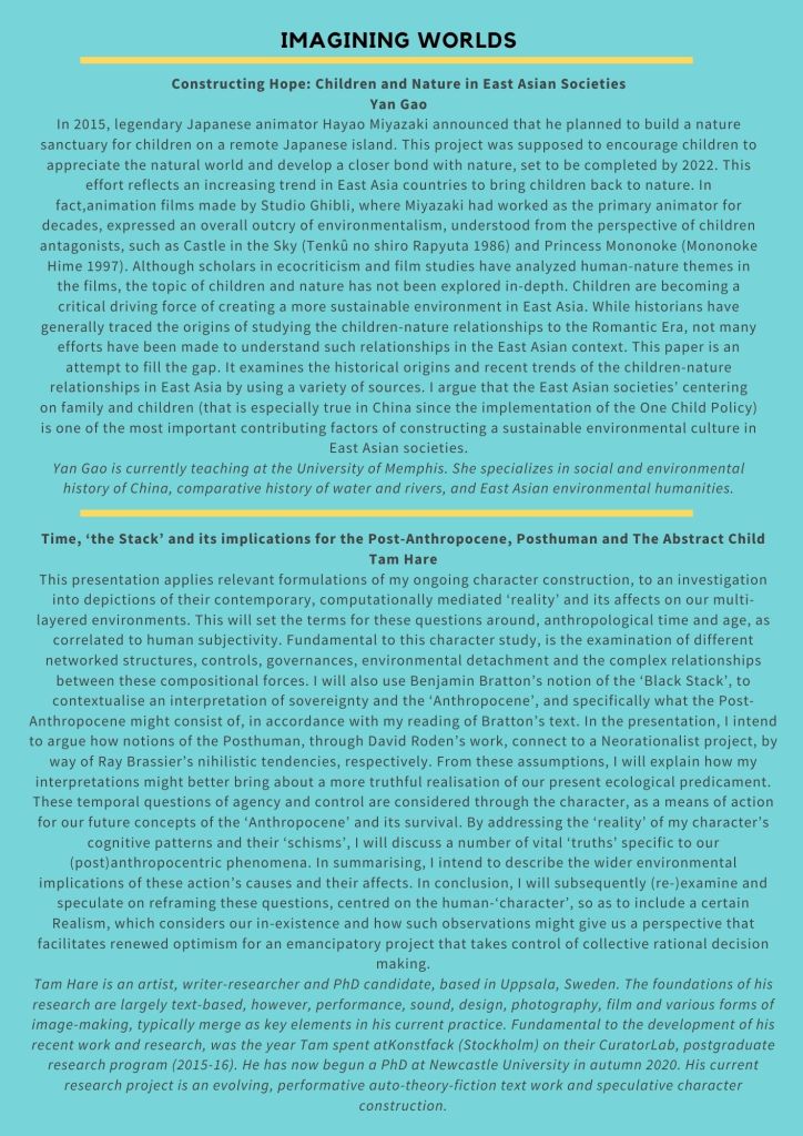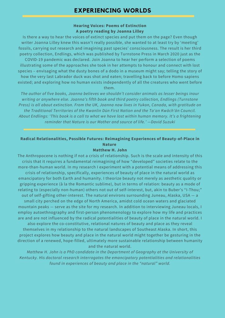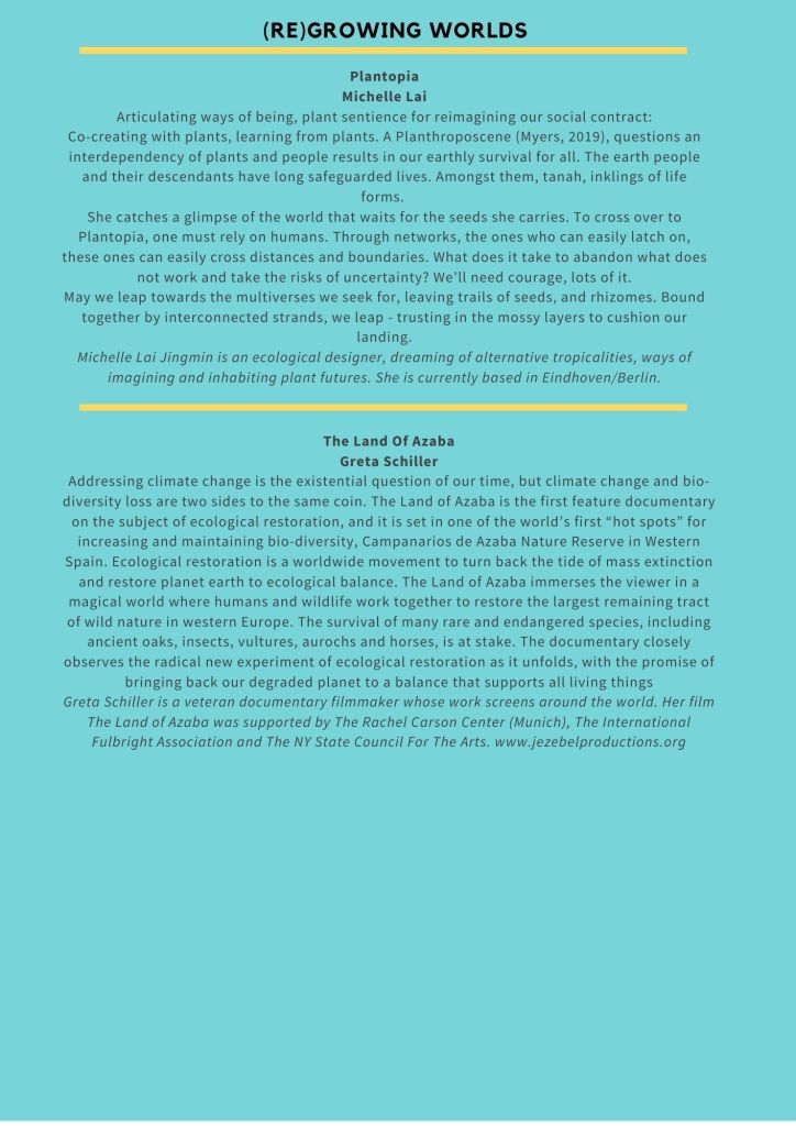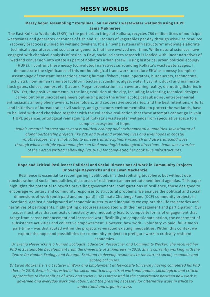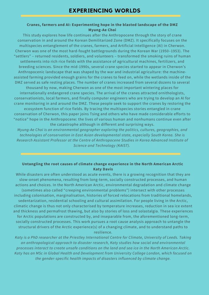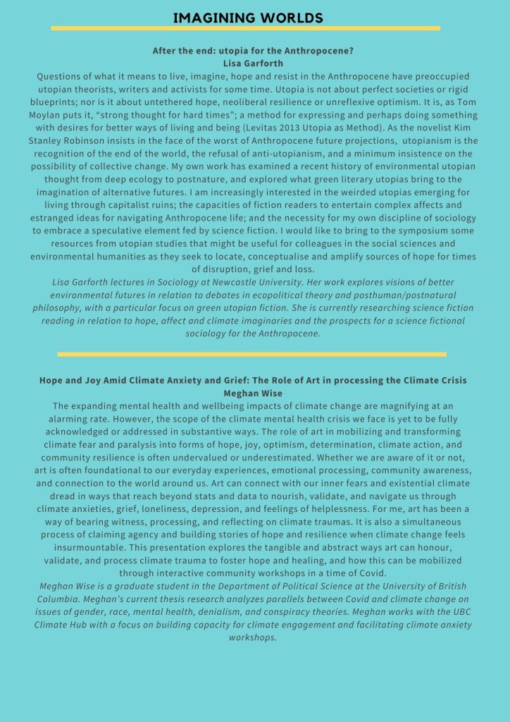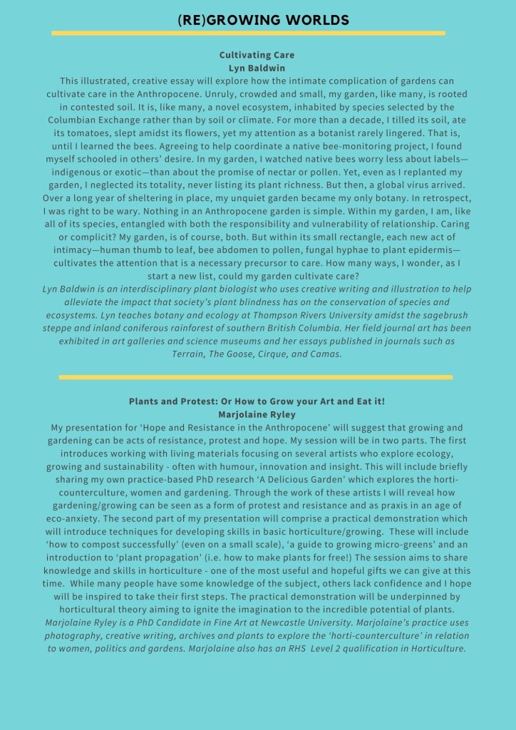 We invite you to join us in an event that ‘acknowledges catastrophe while imagining and enacting possibility’ (Tsing et al 2019), that looks to spaces of ecological hope and practices of environmental resistance while consciously and critically bearing witness to extractive logics, unjust systems of organisation and production, unequal experiences of loss and differing capacities to resist. Through a programme of research, stories, film and practice, we will think through the ways in which we cope, counter and confront life and loss in the anthropocene.