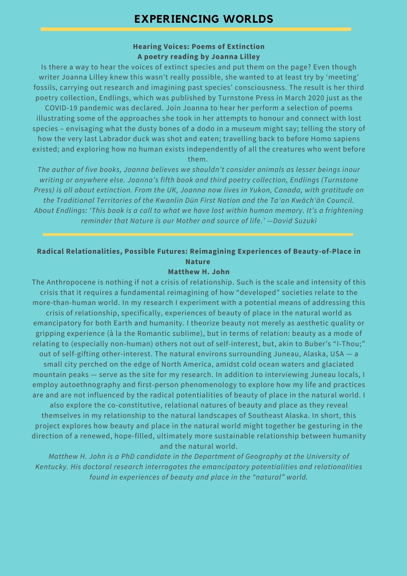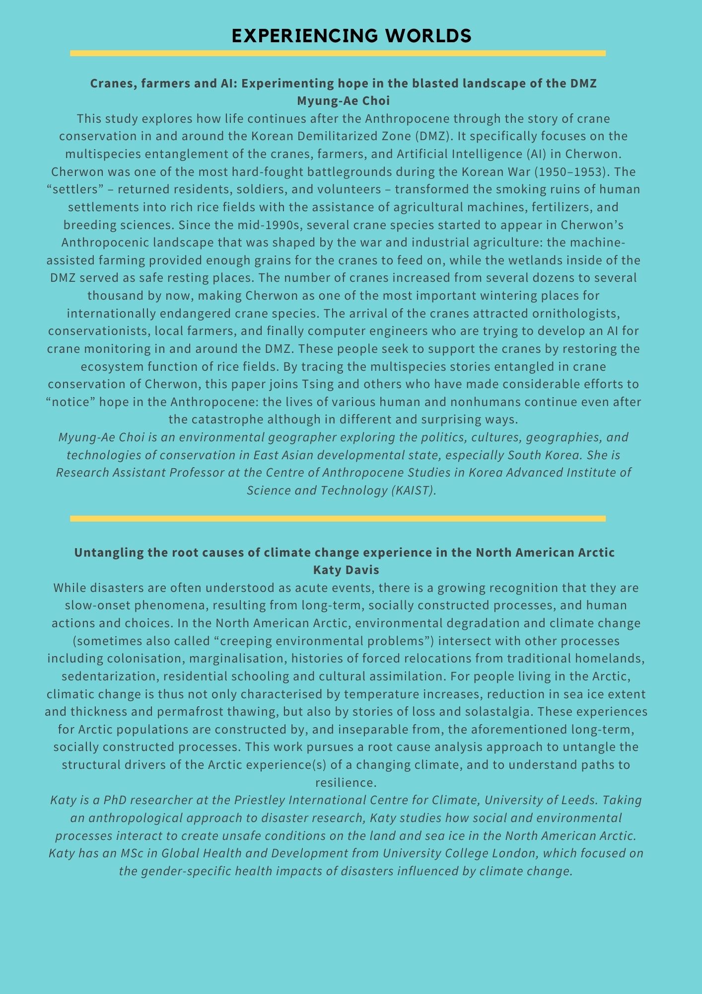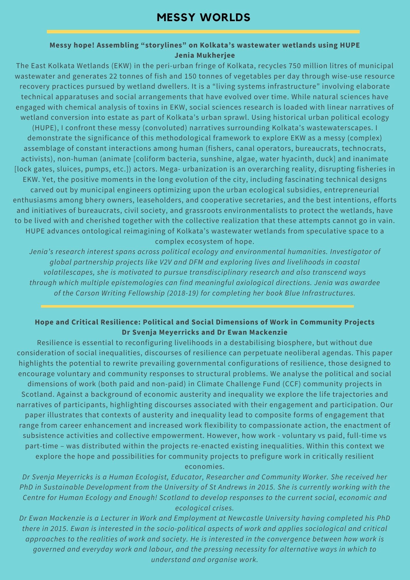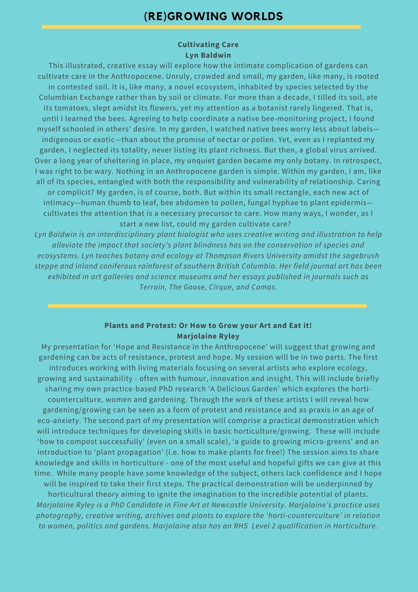We invite you to join us in an event that ‘acknowledges catastrophe while imagining and enacting possibility’ (Tsing et al 2019), that looks to spaces of ecological hope and practices of environmental resistance while consciously and critically bearing witness to extractive logics, unjust systems of organisation and production, unequal experiences of loss and differing capacities to resist. Through a programme of research, stories, film and practice, we will think through the ways in which we cope, counter and confront life and loss in the anthropocene.