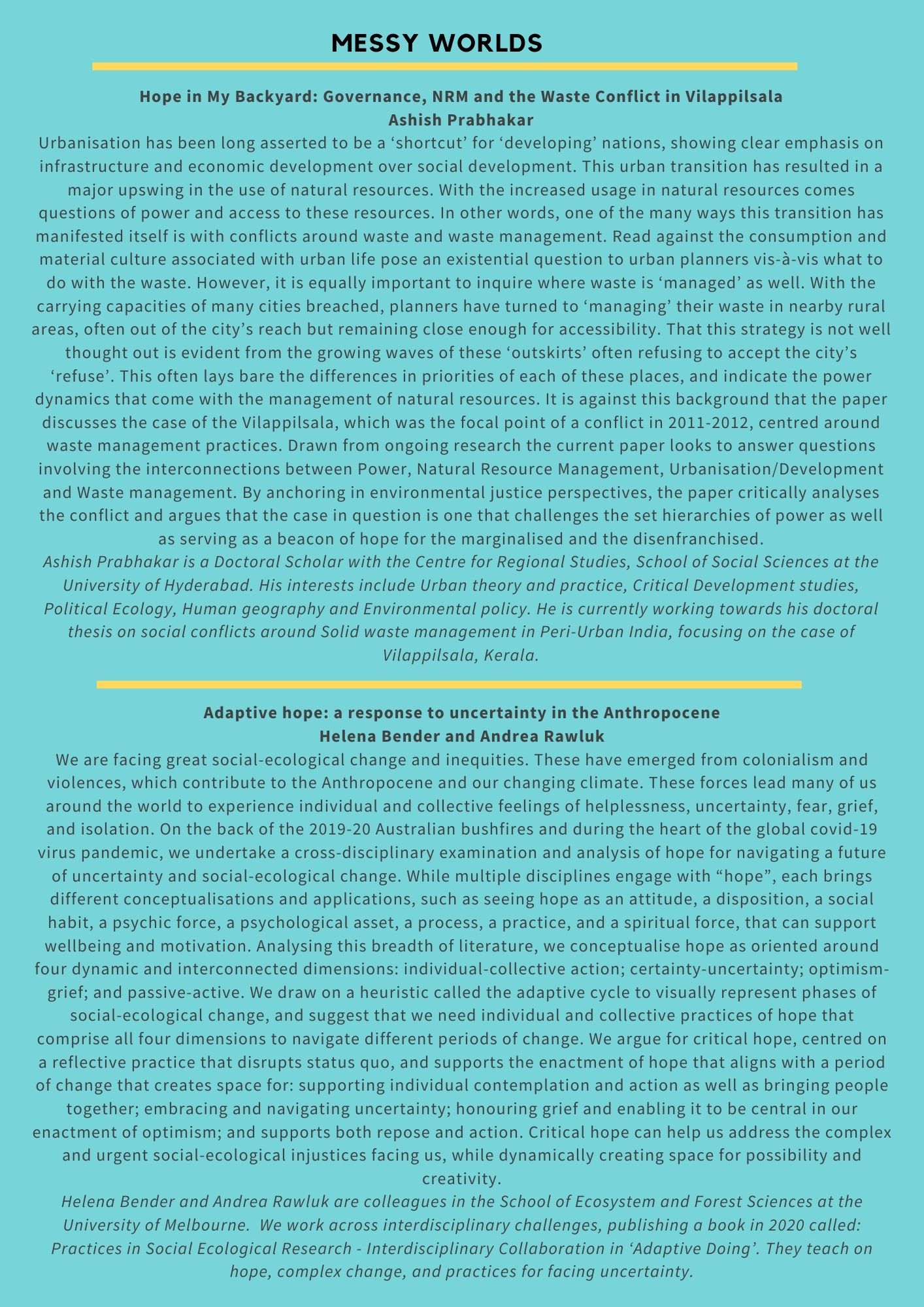 What does it mean to live, hope and resist in the anthropocene? What does environmental participation and being human entail in the ‘age of extinction’? In this symposium, we reflect on hope and resistance as a response to life and loss in the anthropocene, and ask what sustains us and what it means in practice and theory to be citizens and humans in these trying times